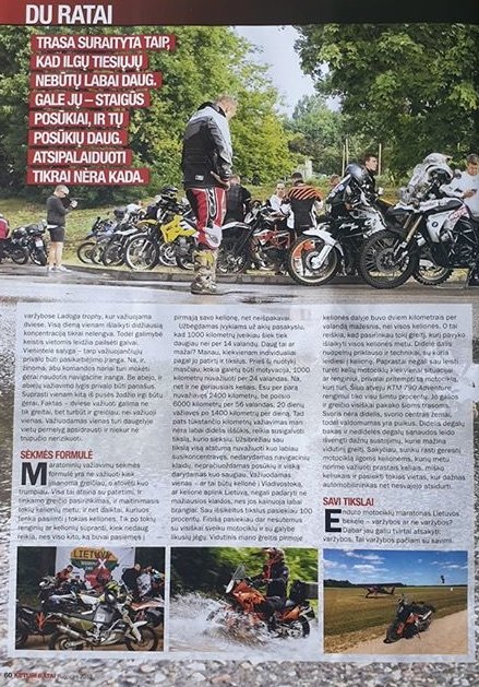 Enduro motociklų maratonas Lietuvos bekele – varžybos ar ne varžybos? Dabar jau galiu tvirtai atsakyti: varžybos. Tai varžybos pačiam su savimi. Manau, net neverta pradėti važiuoti, jei šiame renginyje norite aplenkti savo komandos draugą, kaimyną ar kitą komandą. Tai varžybos su savimi, savo galva, disciplina, laiko planavimu. Bet juk panašiai yra ir maratoninėse lenktynėse, tokiose kaip Ladoga trophy, Breslau rally, Dakare ar Africa Eco Race. Ten laimi ne greičiausiai važiuojantieji, o darantieji mažiausiai klaidų tiek trasoje, tiek už trasos ribų. Lietuvoje 1000 km per 24 valandas renginyje niekas nefiksuoja finišo laiko, bet turbūt dar daugeliui teks dalyvauti ne viename tokiame renginyje, kol supras, kad tikslas yra procesas, o ne finišo linijos kirtimas po tam tikro laiko. Man dalyvavimas maratoniniuose važiavimuose yra tam tikra meditacijos forma, kai lieki tik tu ir kelias. Nelieka šalutinių minčių apie laiką, apie tai, kas laukia rytoj ar kas buvo vakar. Tik tu, motociklas ir kelias. Vieniems renginys patiko, kitiems – ne. Ir tai yra normalu, bet tikiuosi, kad nei organizatoriai, nei dalyviai nesustos ties pirmuoju unikaliu renginiu ir dalyvavimas jame suteiks daug neįkainojamos patirties ateities kelionėms savų svajonių link. Smagaus visiems kelio.