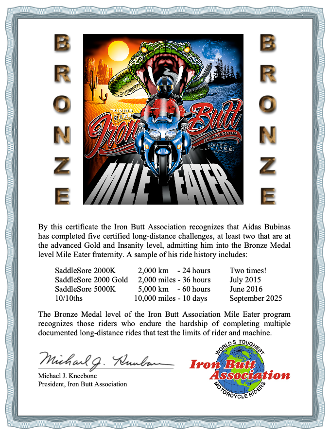 Žemiau pateikiu IBA (Iron Butt Association) sertifikatus, kaip įrodymą, kad turiu šiek tiek patirties ir kalbu ne iš sausos teorijos.